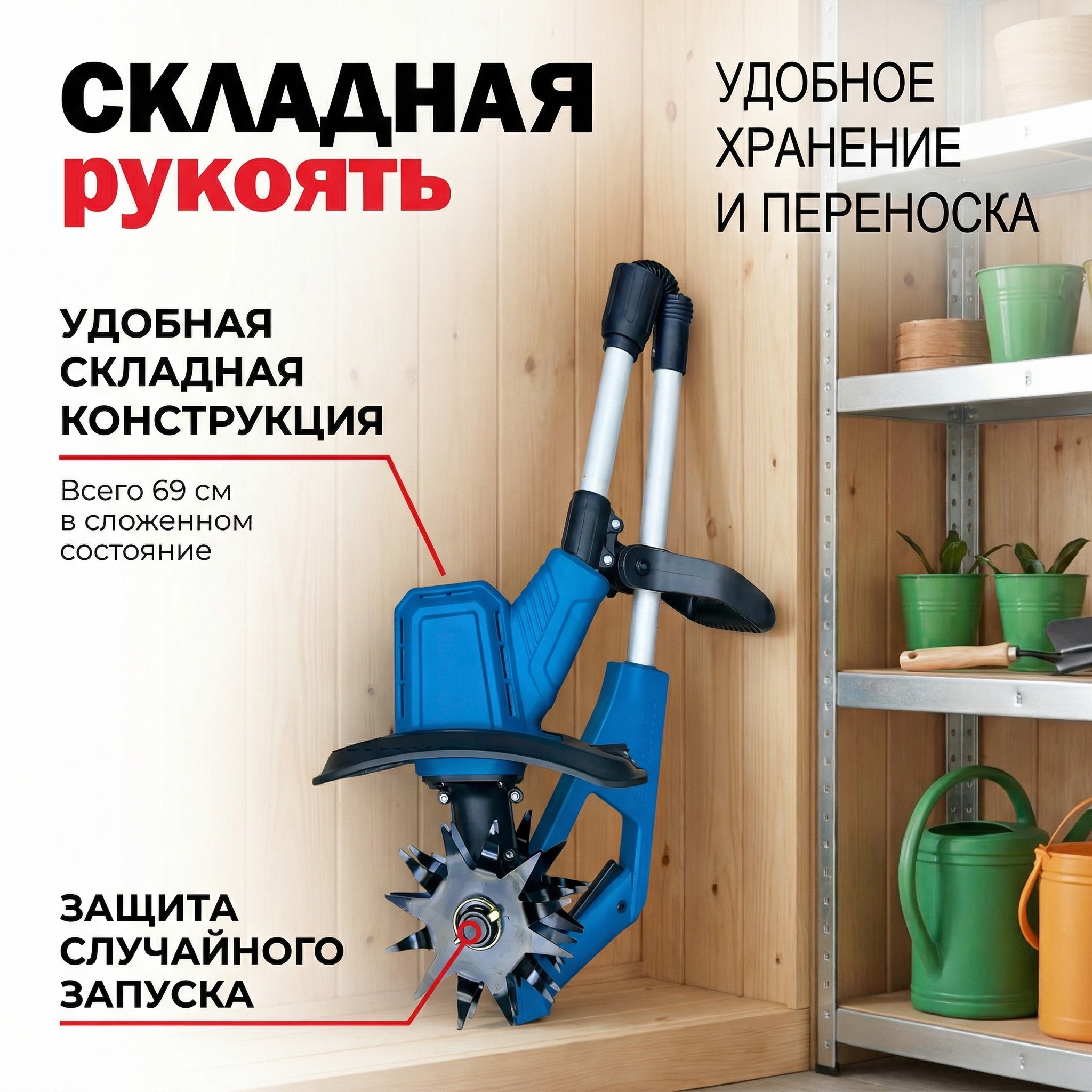 Не нужно тратить деньги на аренду мотоблока. Культиватор с аккумулятором, не требует постоянной заправки. Работает где угодно, без лишних затрат!