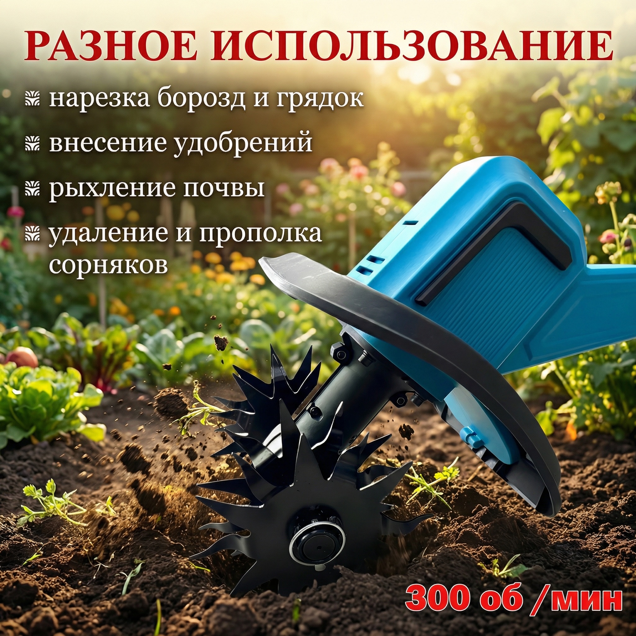 Лёгкий и компактный культиватор для сада. Подходит для работы с грунтом и грядками. Работает от аккумулятора без проводов!